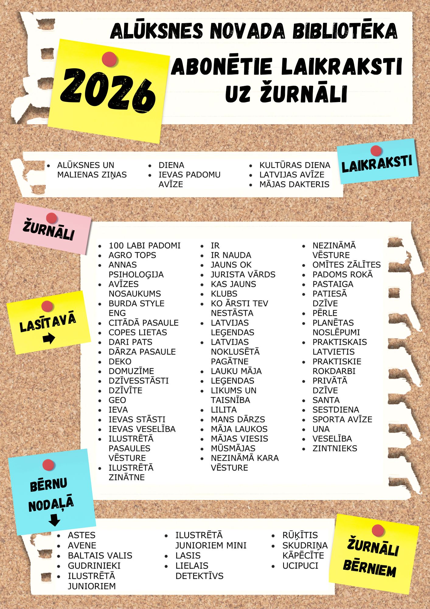 Bibliotēka arī 2026. gadā piedāvā plašu un daudzveidīgu abonēto preses izdevumu klāstu – laikrakstus un žurnālus dažādām interesēm gan bērniem, gan pieaugušajiem. Pie mums atradīsiet gan aktuālākās ziņas, gan izzinošus, praktiskus un izklaidējošus rakstus par kultūru, veselību, dārzkopību, dzīvesstilu, vēsturi un citām tēmām. Laikraksti un jaunākie žurnālu numuri pieejami bibliotēkas lasītavā lasīšanai uz vietas. Žurnālu visi iepriekšējie numuri tiek izsniegti arī lasīšanai uz mājām. Bērnu literatūras nodaļā žurnāli pieejami gan lasīšanai uz vietas, gan līdzņemšanai.