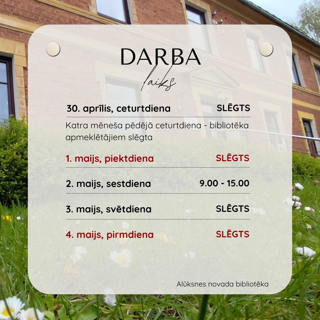 - 30. aprīlis – slēgts (spodrības / metodiskā diena)
