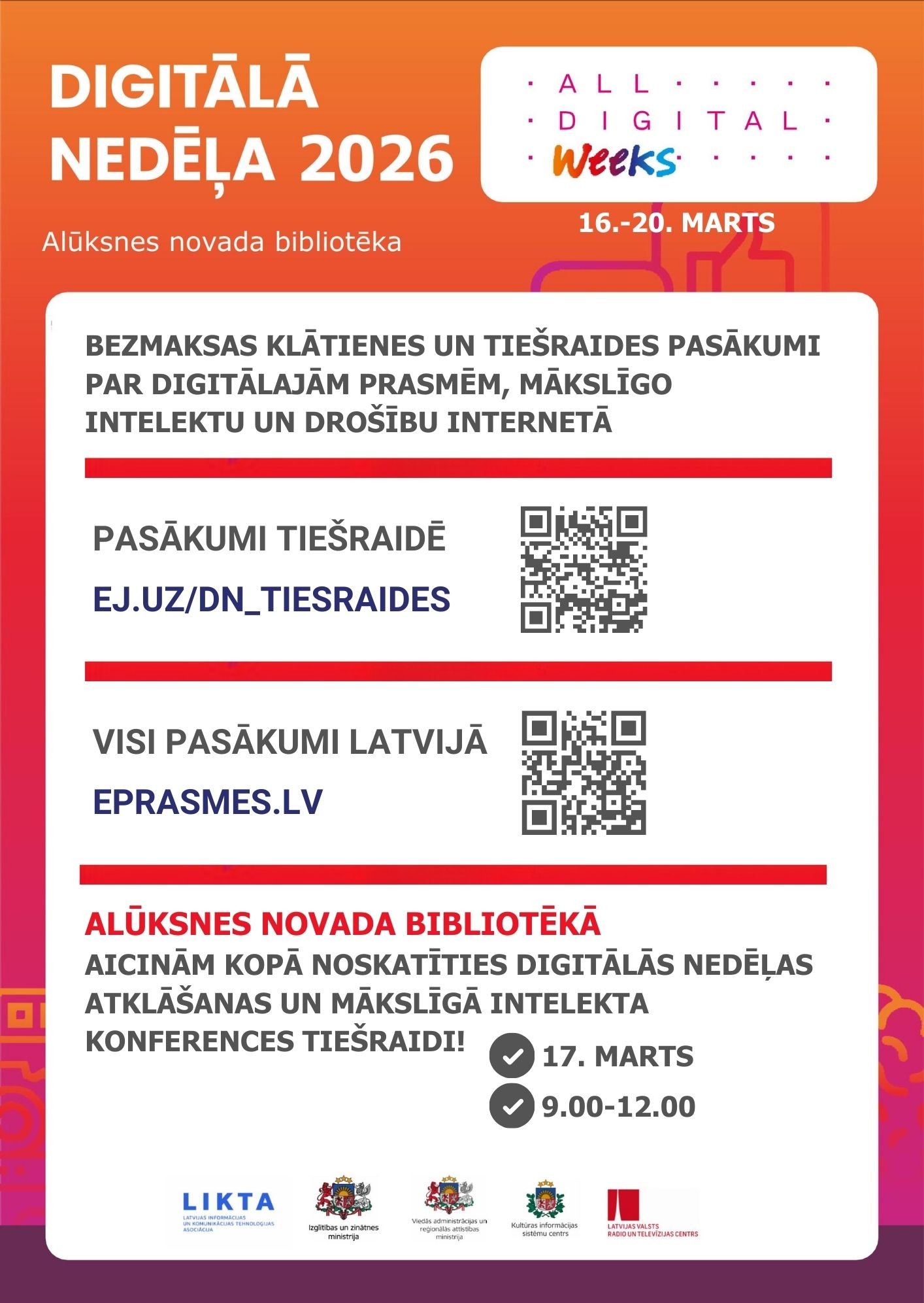 Digitālās nedēļas 2026 atklāšana. 9.00 – 9.55. Ikviens interesents varēs sekot līdzi tiešraidei LIKTA Facebook. Plašāka informācija – ŠEIT. AICINĀM NĀKT SKATĪTIES KOPĀ ALŪKSNES NOVADA BIBLIOTĒKĀ