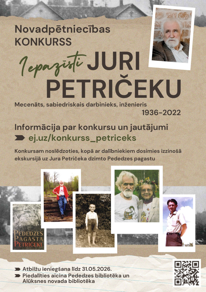 Pededzes bibliotēka un Alūksnes novada bibliotēka aicina ikvienu izzināt Jura Petričeka dzīves gājumu, piedaloties konkursā – tā noslēgumā kopā ar dalībniekiem dosimies izzinošā ekskursijā uz Jura Petričeka dzimto Pededzes pagastu, kuru viņš, kā pats raksta, uzskatīja par paradīzi zemes virsū. J.Petričeka interese par dzimtas vēsturi pārvērtās apjomīgā pētījumā un 2015. gadā izdota grāmata “Pededzes pagasta Petričeki”. Tā būs nozīmīgākais avots, kurā meklēt atbildes uz konkursa jautājumiem. Grāmata pieejama Pededzes bibliotēkā un Alūksnes novada bibliotēkā. Atbildes tāpat meklējamas laikrakstos “Alūksnes Ziņas”, “Latgales laiks”, “Lauku avīze”, “Latvietis”, vietnēs: latviesi.com, aluksne.lv.