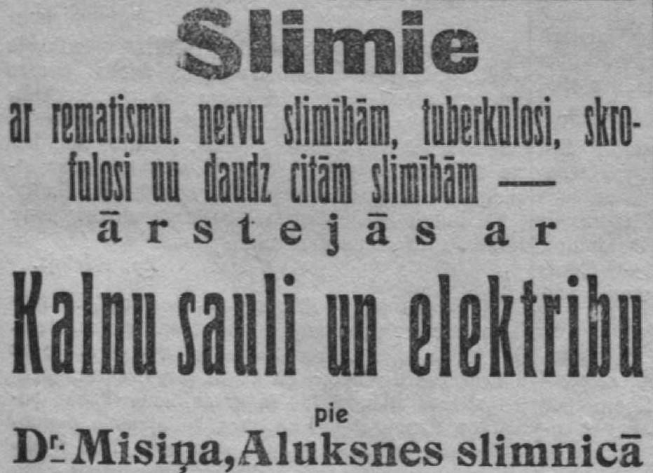 Pirms 100 gadiem. Ārstēšanās ar elektrību. “Slimie ar reimatismu, nervu slimībām, tuberkulosi, skrofulosi un daudz citām slimībām – ārstējas ar kalnu sauli un elektrību pie Dr. Misiņa Alūksnes slimnīcā.” Malienas Ziņas, 1925. gada 17. decembrī.