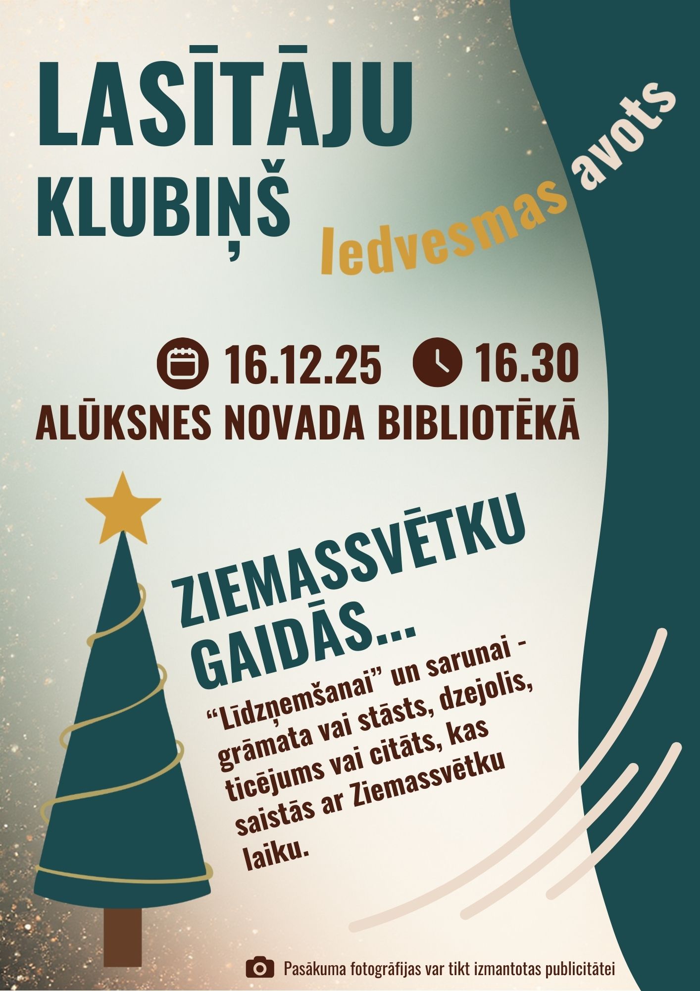 Lasītāju klubiņa tikšanās "Ziemassvētku gaidās" 2025. gada 16. decembrī, plakāts.